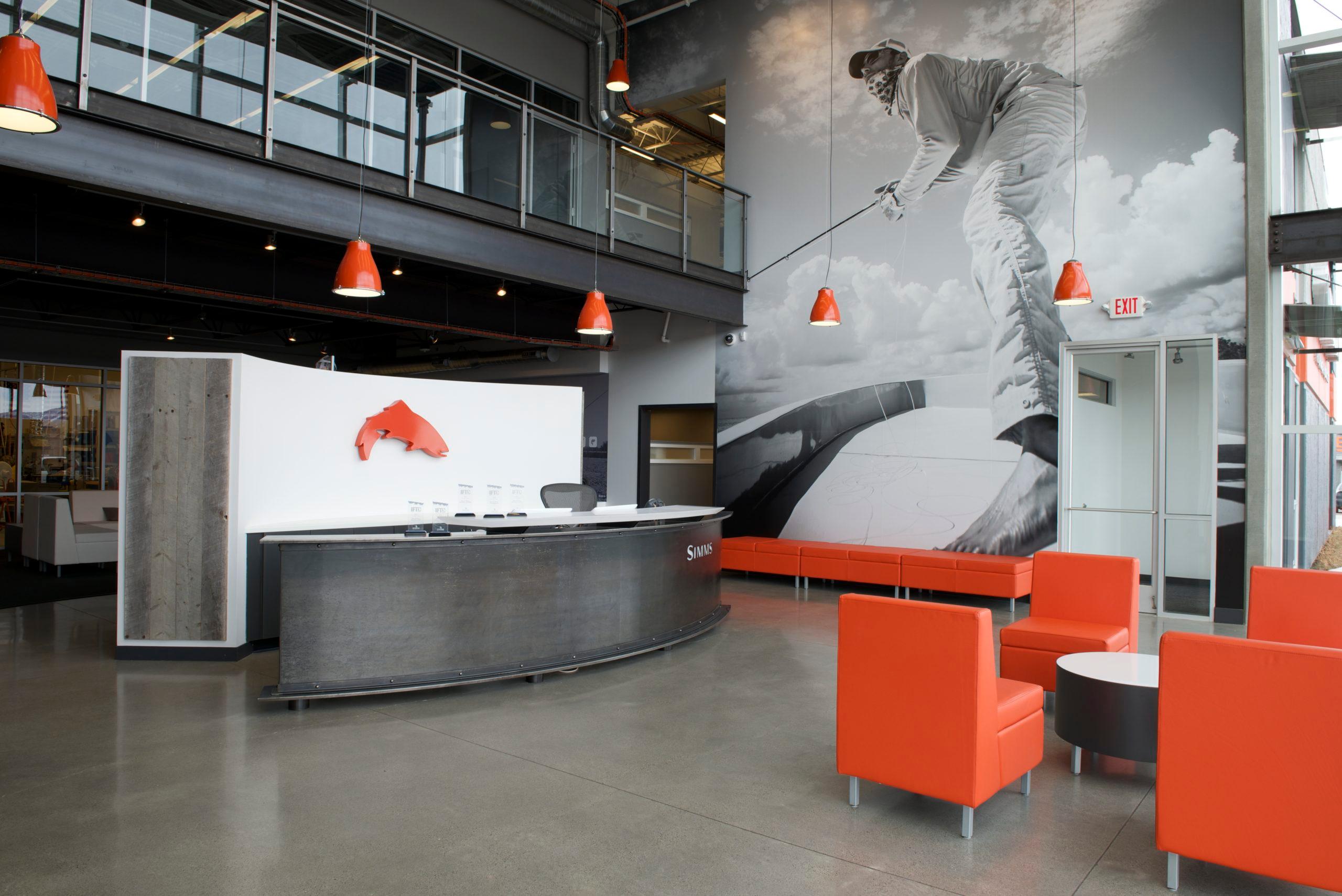 Simms Fishing Products is a company that develops the world’s premier technical fishing apparel, footwear, and equipment. When the company relocated its headquarters in Bozeman, Montana in 2012, it engaged JLF Architects and Big-D Construction to design and build a facility that would speak to the company’s brand as the “icon” in the fishing industry. Simms encourages its customer base to visit their headquarters, so incorporating a brand narrative into the design was essential.