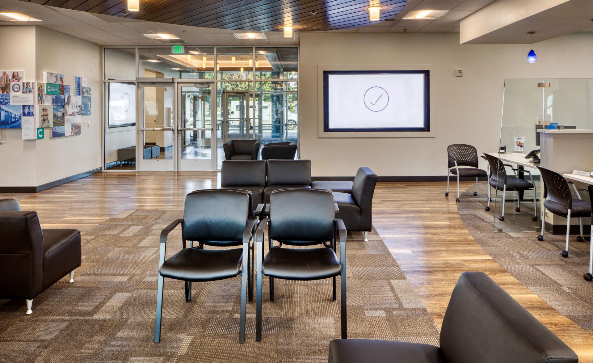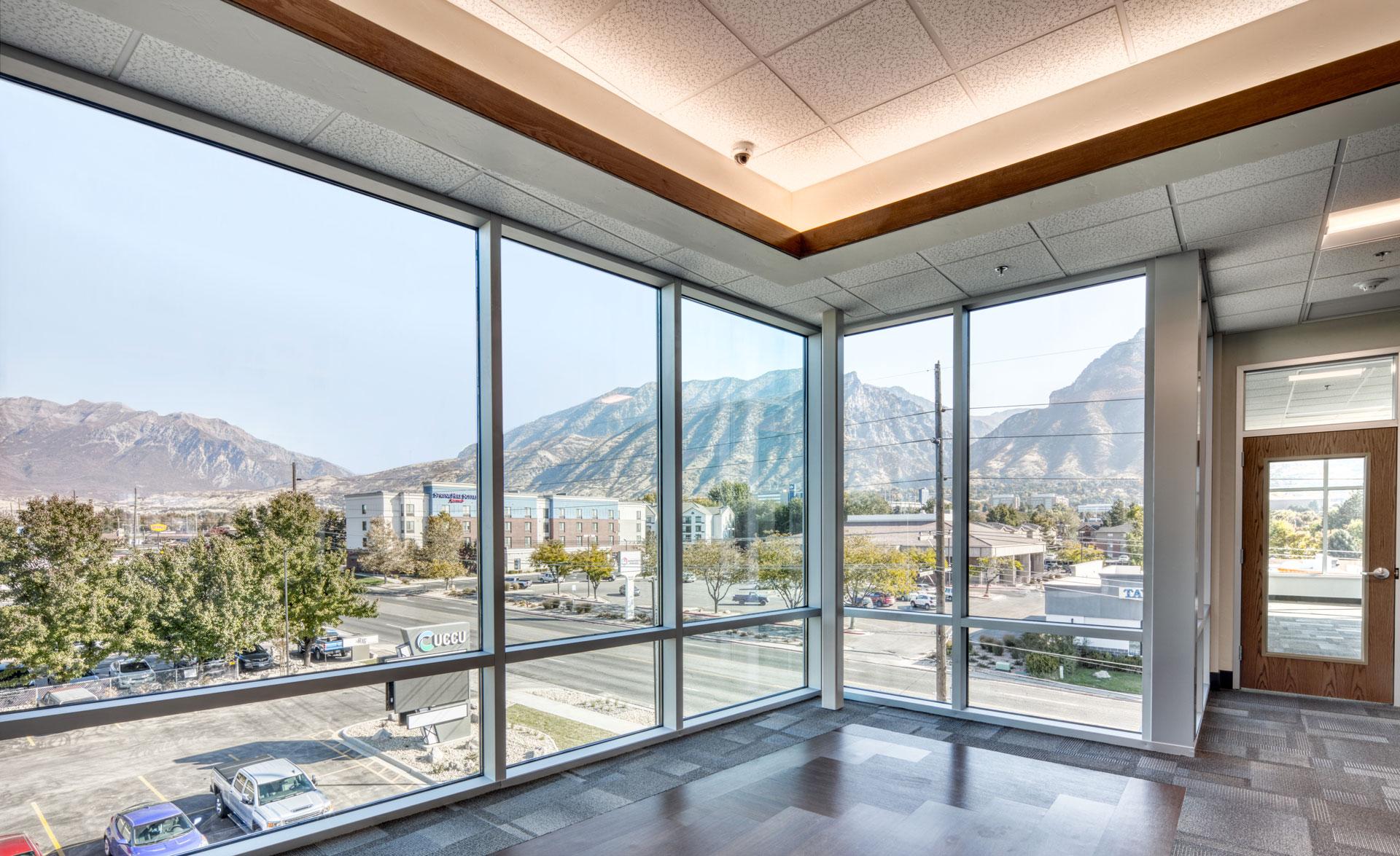 The Utah Community Credit Union Freedom Office & Warehouse project is comprised of a new, three-story, 23,860-sf building with a credit union branch location on the lower level, administrative offices on the second and third floors, and an additional 3,875-sf warehouse building with a small mezzanine. The main building features modern finishes, wood and tile accents, oversized windows, and contemporary lighting.
