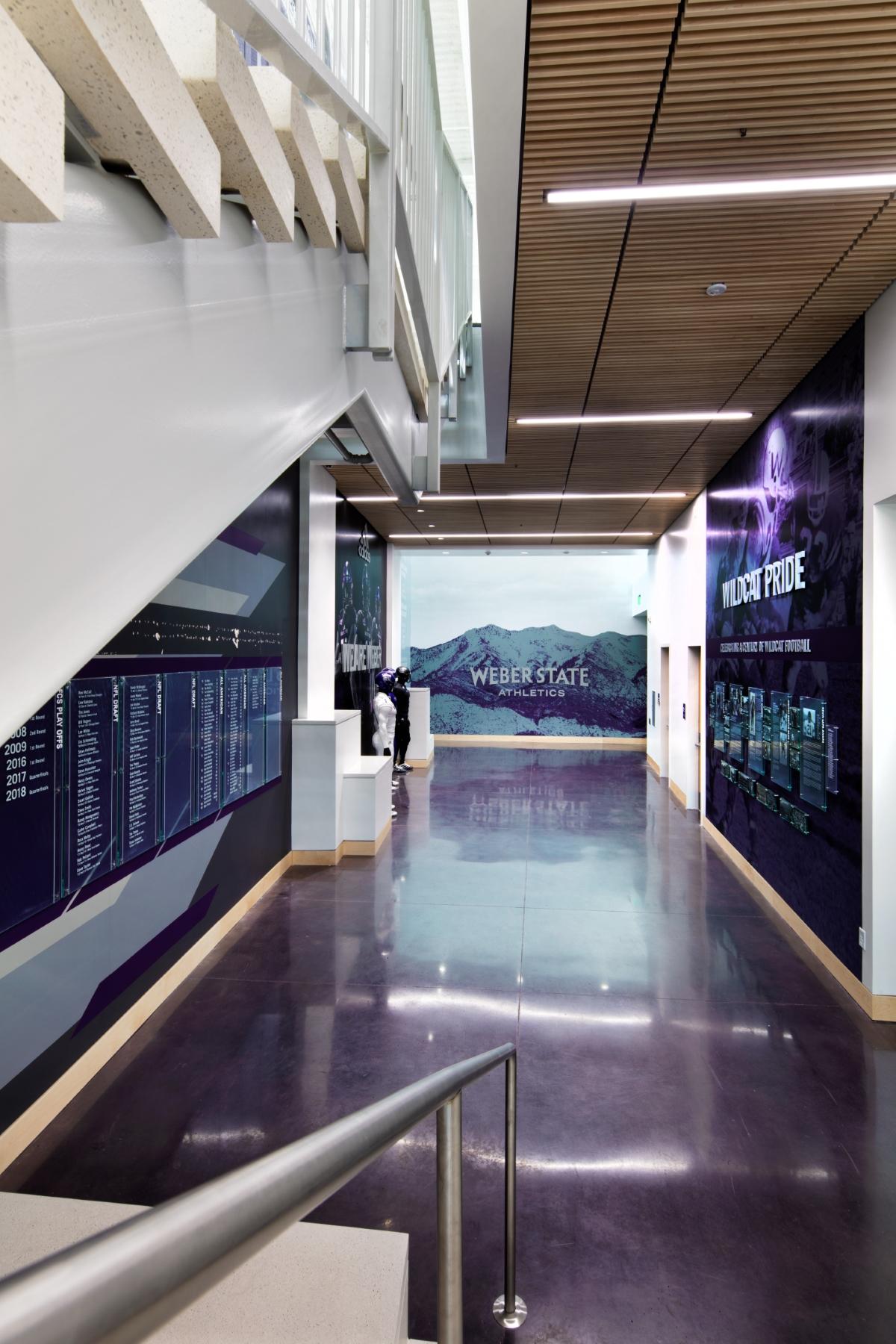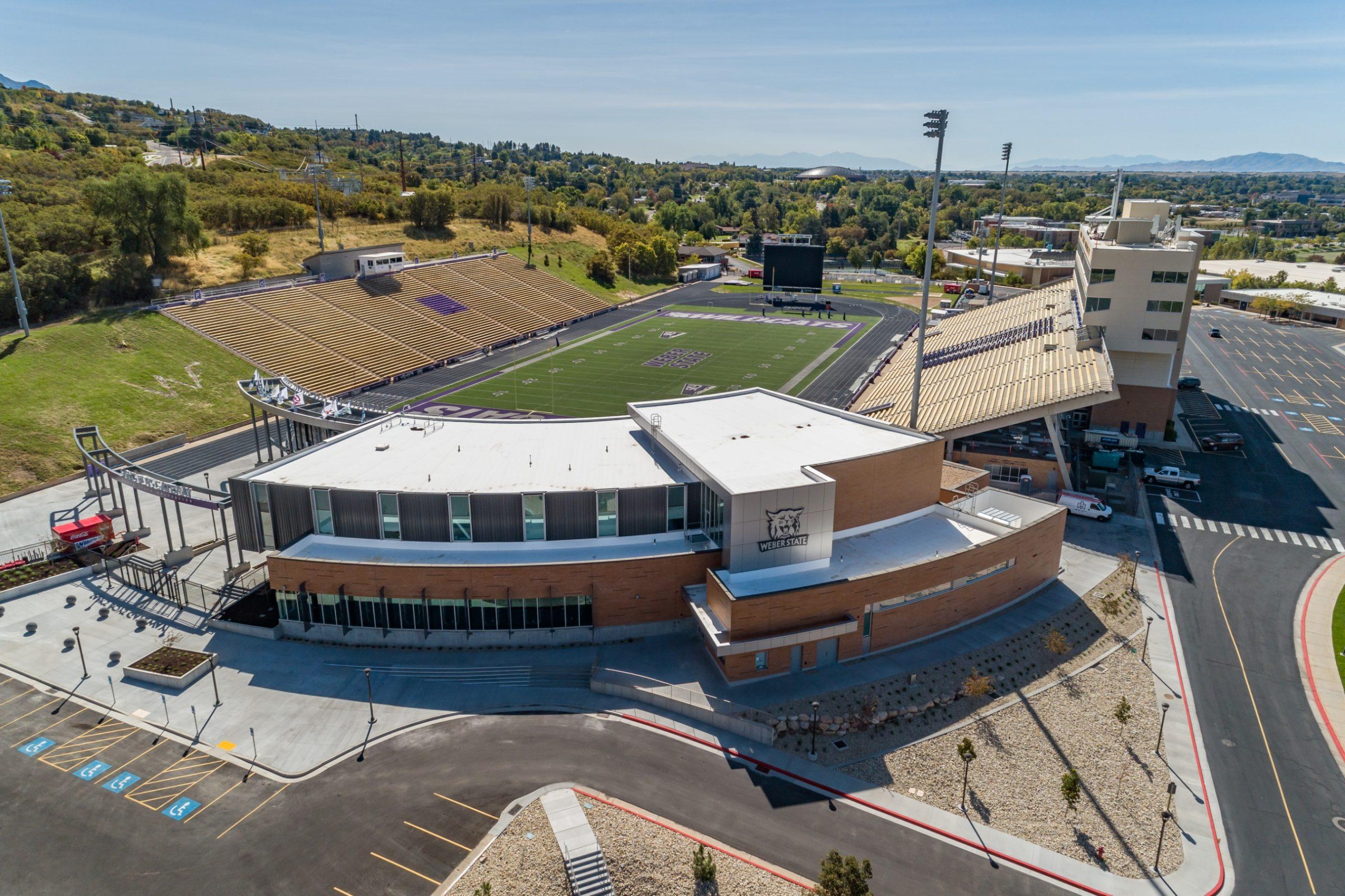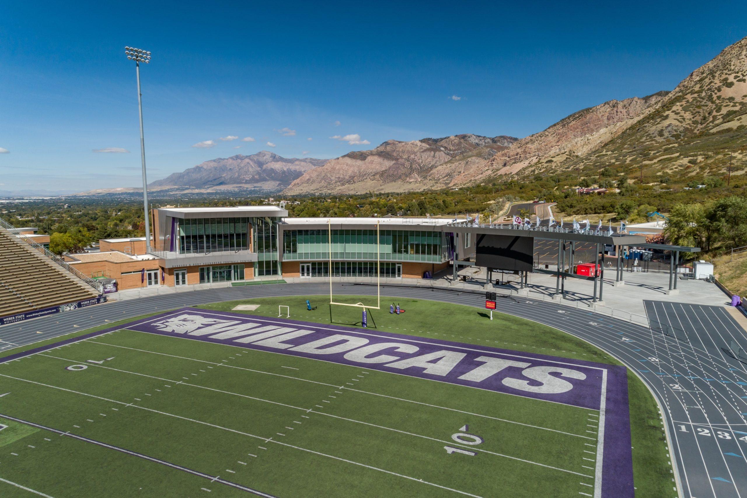 The Youngberg Football Center is a new, two-story state-of-the-art football support facility located at the north end of the Stewart Stadium at WSU’s Ogden campus. The new building features a prominent patron entry gateway plaza with ticketing office and concession areas, a professional grade locker room, and an advanced strength and conditioning facility for all Wildcat student-athletes. The new Center layout also includes a 125-seat auditorium-style team room, equipment room, unisex restrooms, coaches’ offices, position group meeting rooms, a communications / A/V room with editing capabilities, and second floor terrace. Building materials and finishes are all durable high-quality materials including wood, stone, metal, and melamine, and specialty athletic rubber flooring throughout the building. Big-D self-performed the concrete work on the project and extensive landscaping which included hardscapes, rock-retaining walls, trees, and shrubs.